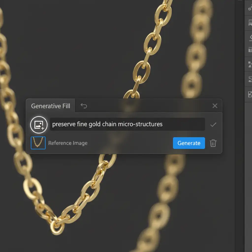 Restoring AI erased jewelry details requires a deep understanding of layer mathematics, masking, and AI behavior. While Generative Fill is an incredible tool for extending backgrounds and removing large distractions, it simply cannot be trusted with the intricate facets of high-end jewelry. A single blurred chain link or missing diamond reflection can ruin the perceived value of a luxury product.