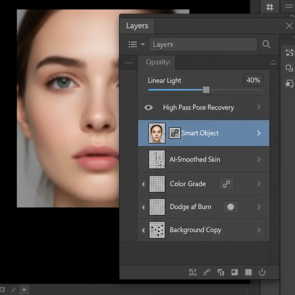 - Dial in Opacity: Drop the layer opacity to 30–50% to softly blend the original pores back into the skin.