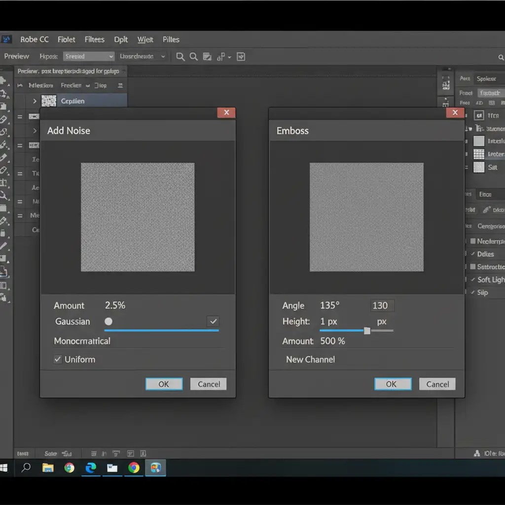 What happens when the original texture is entirely lost, and there is no healthy skin to graft from? You must generate synthetic pores from scratch. While this sounds intimidating, combining Monochromatic Noise with an Emboss filter creates highly realistic results.
