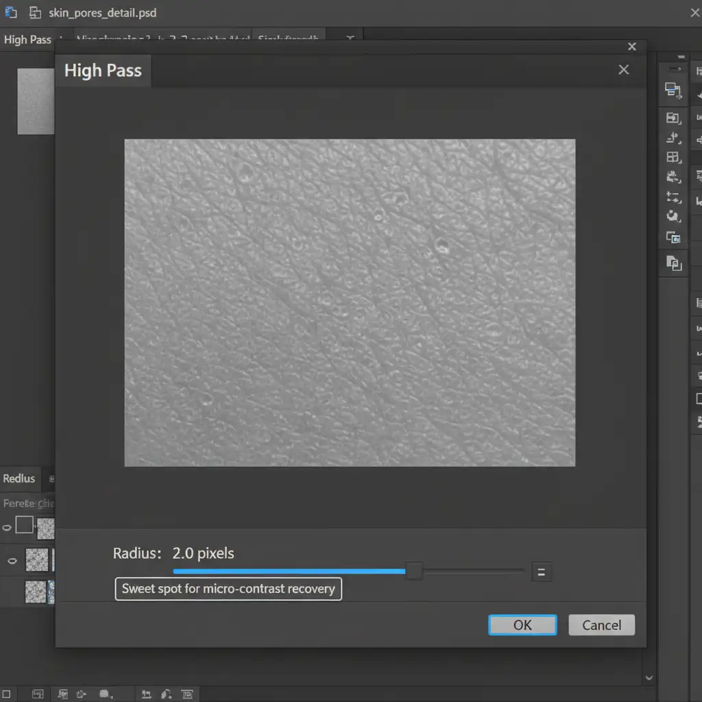 - Set the Radius: Adjust the radius to isolate just the pores. The sweet spot is typically between 1.5px and 2.5px. Anything higher will introduce unwanted tonal shifts and bring back the blemishes you just removed.