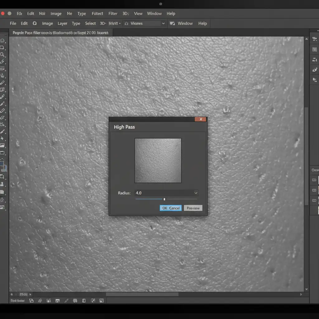 - Extract the Texture: Paste the donor image over your AI headshot. Go to Filter > Other > High Pass. Set the radius to 3-5px. This strips away all color and lighting, leaving only the micro-contrast and pores on a gray background.