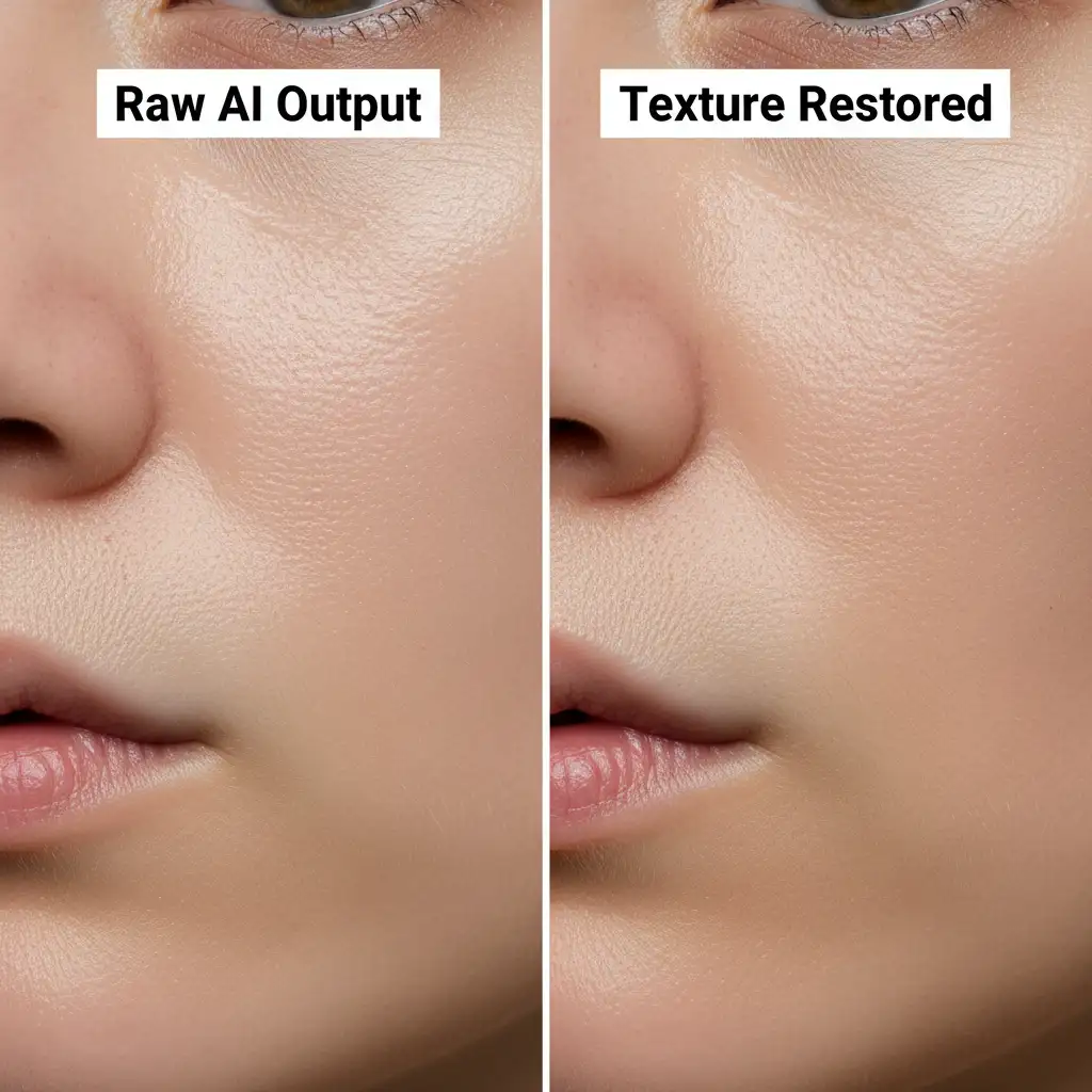 AI image generators are notoriously aggressive when it comes to over-smoothing skin. They strip away the micro-contrast and high-frequency detail necessary to make a human portrait look genuinely photorealistic. Without pores, micro-blemishes, and peach fuzz, the subject falls squarely into the uncanny valley.
