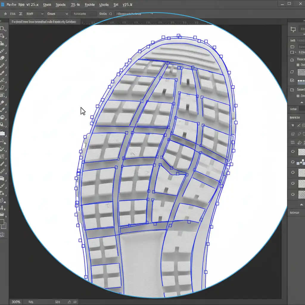 Instead of relying on AI, use the Pen Tool to create a precise clipping path around the intricate ridges of the tread. Convert this path into a vector mask to isolate the sole perfectly.