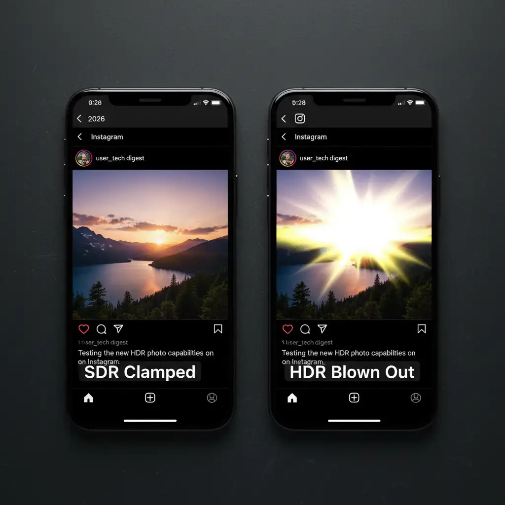 In recent versions of iOS and Android (circa 2025-2026), Instagram implemented automatic processing for HDR gain maps. This primarily affects files saved in the HEIC format rendering pipeline or modern JPEGs exported from software like Photoshop v26 and v27.